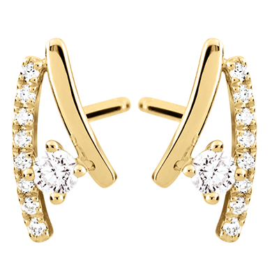 Due preziosi motivi in Oro e diamanti custodiscono un prezioso diamante bianco. Una coppia di orecchini elegante e originale, perfetta in ogni momento della giornata.