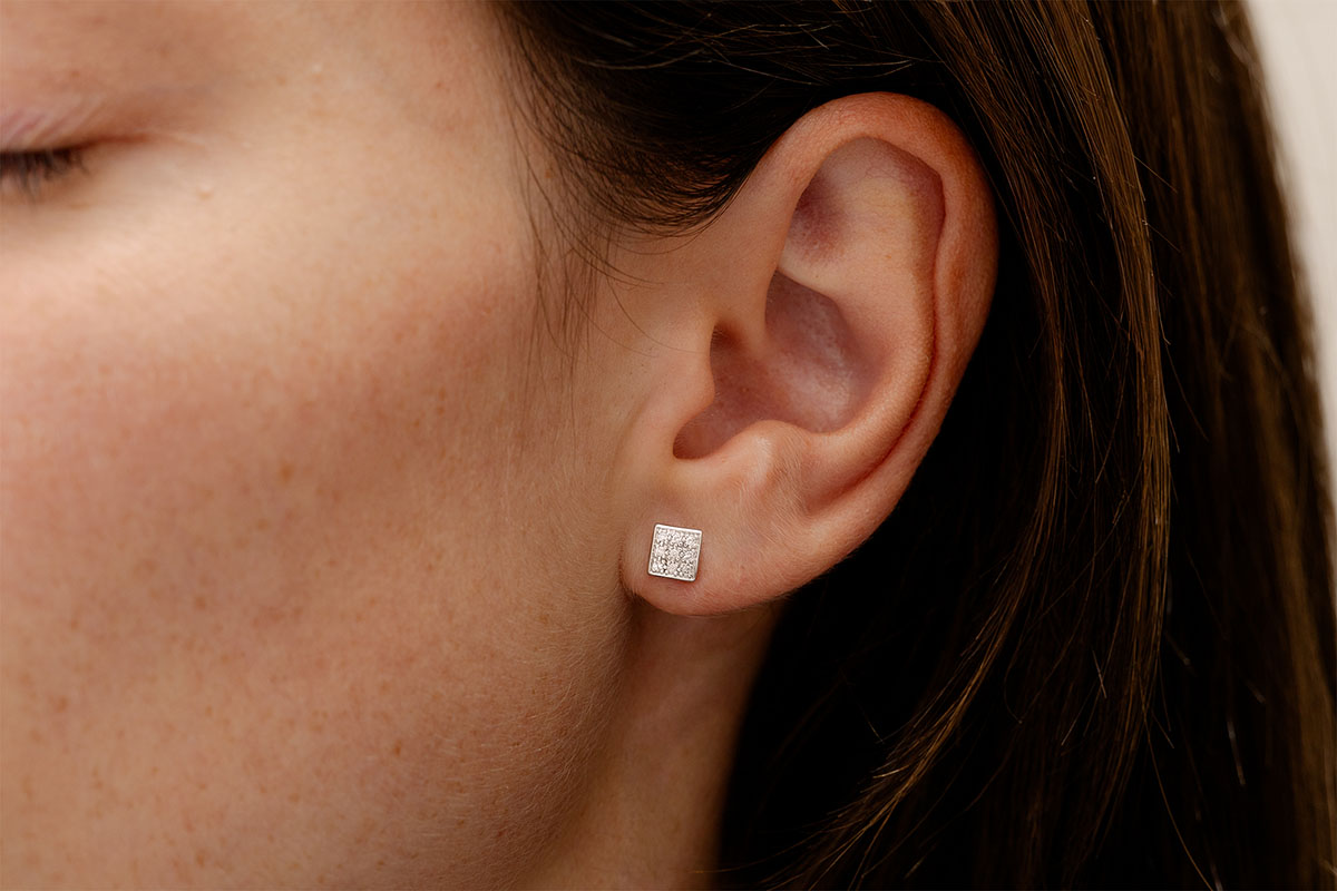 Due piccoli, luminosi quadrati tempestati di diamanti per una coppia di orecchini raffinati e deliziosamente femminili.