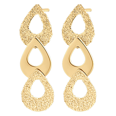 Un paio di orecchini a lobo in oro giallo decisamente moderni. Ornati con un motivo di 3 pere assemblate, due testurizzate - effetto diamante - e una levigata. Colpo di fulmine garantito.