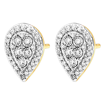 Il bagliore di orecchini con pavé di diamanti a forma di pera, coronati da un alone di diamanti. Un paio di orecchini a lobo in oro bianco e giallo fine e delicato, simbolo di eleganza senza tempo.