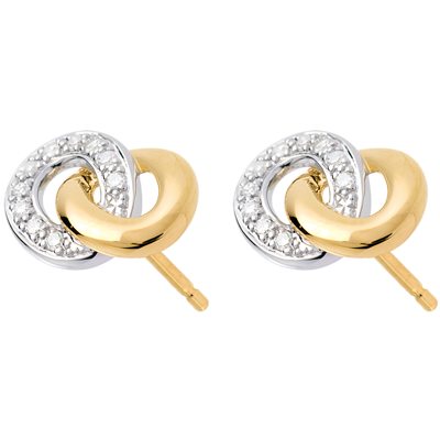 Degli orecchini originali e preziosi, che replicano la maglia a catena di una collana in Oro giallo e Oro bianco pavé uniti in un abbraccio.