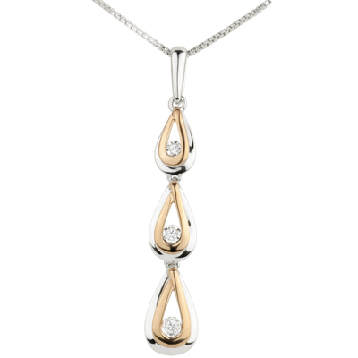 Tre gocce magiche in Oro rosa e bianco ornate di un diamante si uniscono per formare un ciondolo delicato.