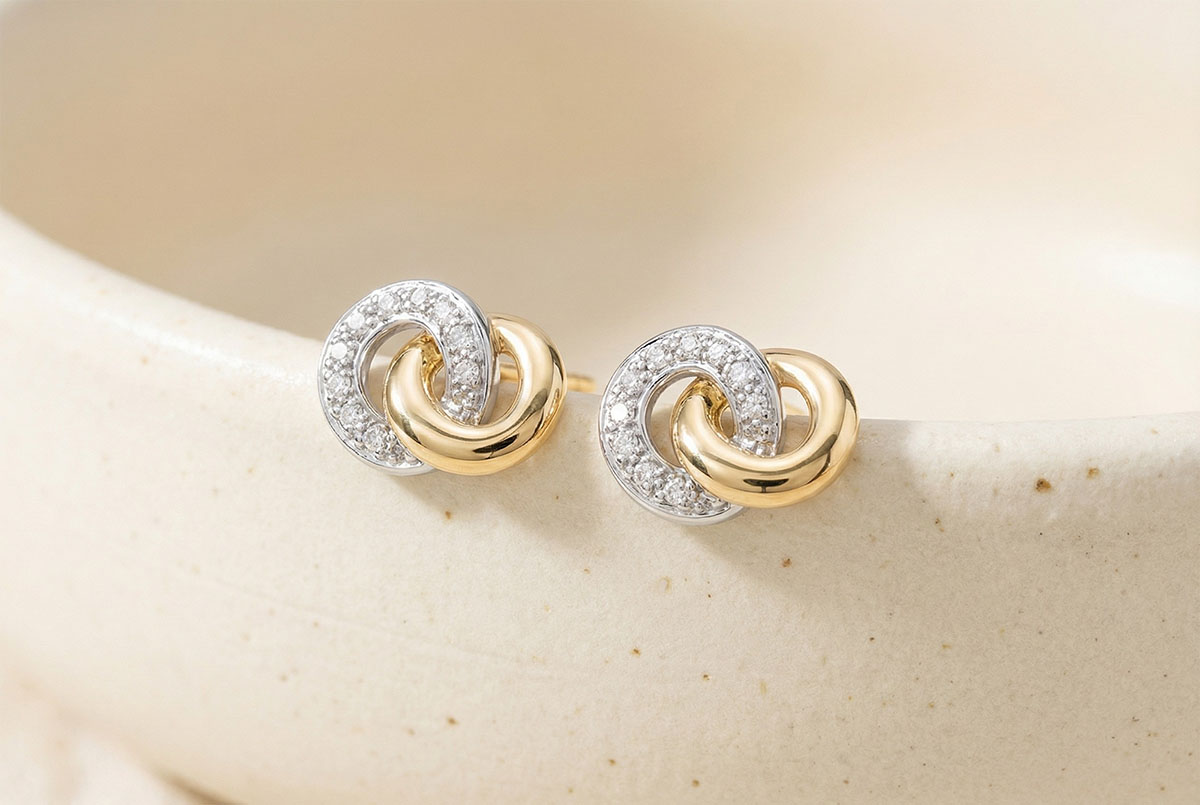 Degli orecchini originali e preziosi, che replicano la maglia a catena di una collana in Oro giallo e Oro bianco pavé uniti in un abbraccio.