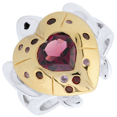 Questa piccola tartaruga d'amore ha il dorso ricoperto d'Oro giallo e da un cuore color rubino circondato da ametiste e granato. Il cuore centrale è in rodolite.