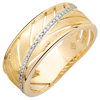 Un anello largo in oro giallo spazzolato dal design leggero, ispirato alla foglia di palma. Il gambo della foglia è impreziosito da una fila di diamanti. Un anello da portare ogni giorno o in occasioni speciali.