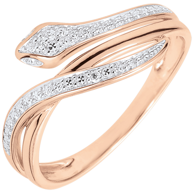 Questo anello serpente d'oro rosa dalle forme sinuose ed ammalianti è adornato di diamanti per un aspetto elegante e moderno.