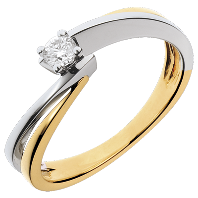La sobrietà di un diamante solitario al centro di una montatura sinuosa e delicata che abbina due ori.