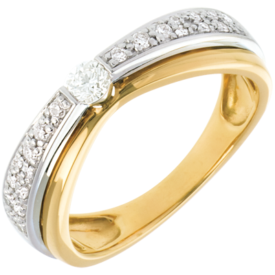 Un turbante a due Ori sottolineati da un pavé delicato per esaltare la brillantezza di un diamante centrale.