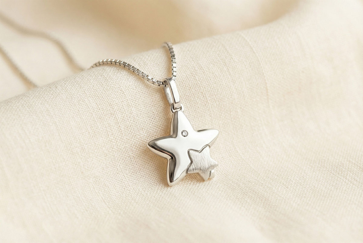 Una grande stella porta con sé una stella più piccola. Un diamante orna una delle sue punte in Oro bianco. Modello grande.