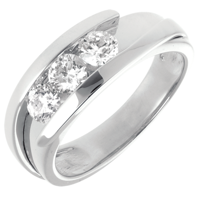 Una montatura sobria e classica sottolineata da un doppio giunco che si apre delicatamente su una trilogia di diamanti.