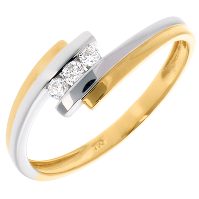 Una trilogia di diamanti abbracciata da un doppio giunco in Oro giallo e bianco, per un anello femminile e delicato.