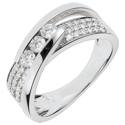 Una trilogia delicatamente stretta in equilibrio tra due piccoli archi in Oro bianco su una montatura semi pavé.