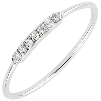 Un anello grafico e minimalista, impreziosito da una fila di 7 diamanti, numero perfetto, essenziale e divino.