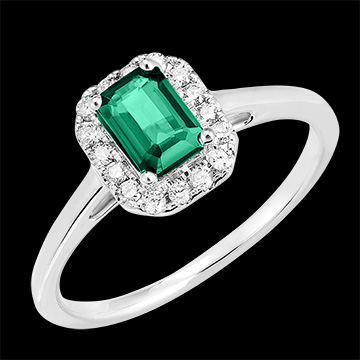 « L'ATELIER » N. 1007027Anello Oro bianco 9 carati - Smeraldo sintetico Rettangolo 0.5 Carati - Halo Diamante di laboratorio 4.9