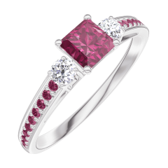 Anello Oro bianco 9 carati - Rubino Principessa 0.3 Carati - Pietre laterali Diamante - Incastonatura Rubino