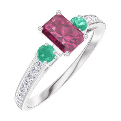 « L'ATELIER » Nº160888Anello Oro bianco 9 carati - Rubino Rettangolo 0.3 Carati - Pietre laterali Smeraldo - Incastonatura Diamante
