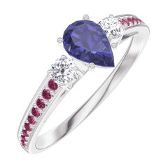 Anello Oro bianco 9 carati - Zaffiro blu Goccia 0.3 Carati - Pietre laterali Diamante - Incastonatura Rubino