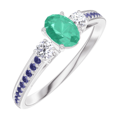 Anello Oro bianco 18 carati - Smeraldo Ovale 0.3 Carati - Pietre laterali Diamante - Incastonatura Zaffiro blu