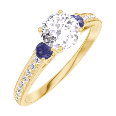 « L'ATELIER » Nº162466Anello Oro giallo 9 carati - Diamante Rotonda 0.5 Carati - Pietre laterali Zaffiro blu - Incastonatura Diamante 4.9
