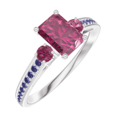 Anello Oro bianco 18 carati - Rubino Rettangolo 0.5 Carati - Pietre laterali Rubino - Incastonatura Zaffiro blu