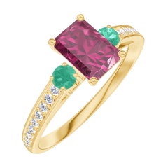 Anello Oro giallo 18 carati - Rubino Rettangolo 0.5 Carati - Pietre laterali Smeraldo - Incastonatura Diamante
