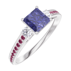 Anello Oro bianco 9 carati - Zaffiro blu Principessa 0.5 Carati - Pietre laterali Diamante - Incastonatura Rubino