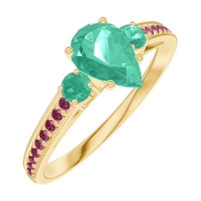 « L'ATELIER » Nº164690Anello Oro giallo 9 carati - Smeraldo Goccia 0.5 Carati - Pietre laterali Smeraldo - Incastonatura Rubino