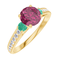 Anello Oro giallo 9 carati - Rubino Rotonda 0.7 Carati - Pietre laterali Smeraldo - Incastonatura Diamante