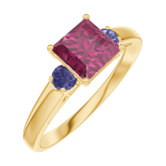 Anello Oro giallo 18 carati - Rubino Principessa 0.7 Carati - Pietre laterali Zaffiro blu