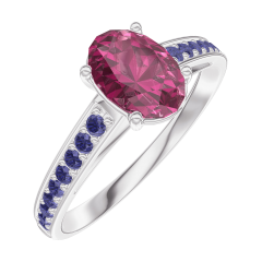 Anello Oro bianco 9 carati - Rubino Ovale 0.7 Carati - Incastonatura Zaffiro blu