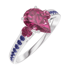 Anello Oro bianco 9 carati - Rubino Goccia 0.7 Carati - Pietre laterali Rubino - Incastonatura Zaffiro blu