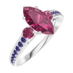 Anello Oro bianco 18 carati - Rubino Marchesa 0.7 Carati - Pietre laterali Rubino - Incastonatura Zaffiro blu