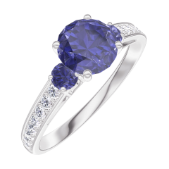 Anello Oro bianco 9 carati - Zaffiro blu Rotonda 0.7 Carati - Pietre laterali Zaffiro blu - Incastonatura Diamante