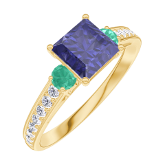 Anello Oro giallo 9 carati - Zaffiro blu Principessa 0.7 Carati - Pietre laterali Smeraldo - Incastonatura Diamante