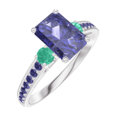 Anello Oro bianco 18 carati - Zaffiro blu Rettangolo 0.7 Carati - Pietre laterali Smeraldo - Incastonatura Zaffiro blu