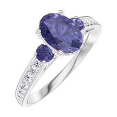 Anello Oro bianco 9 carati - Zaffiro blu Ovale 0.7 Carati - Pietre laterali Zaffiro blu - Incastonatura Diamante