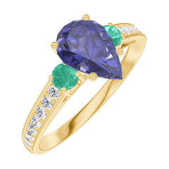 Anello Oro giallo 18 carati - Zaffiro blu Goccia 0.7 Carati - Pietre laterali Smeraldo - Incastonatura Diamante