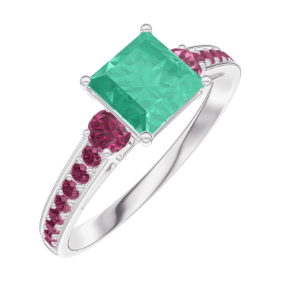 « L'ATELIER » N. 166752Anello Oro bianco 9 carati - Smeraldo Principessa 0.7 Carati - Pietre laterali Rubino - Incastonatura Rubino