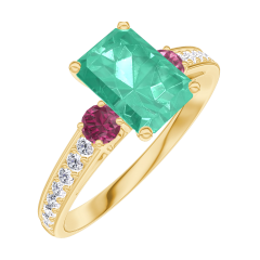 Anello Oro giallo 18 carati - Smeraldo Rettangolo 0.7 Carati - Pietre laterali Rubino - Incastonatura Diamante