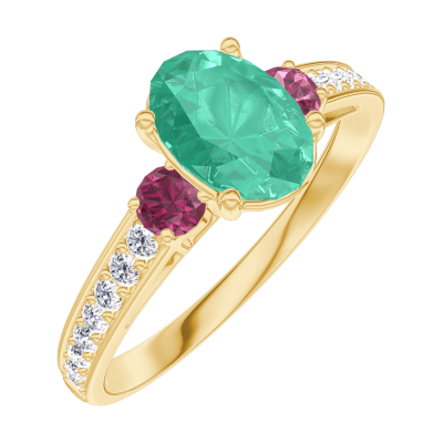 « L'ATELIER » Nº166946Anello Oro giallo 9 carati - Smeraldo Ovale 0.7 Carati - Pietre laterali Rubino - Incastonatura Diamante