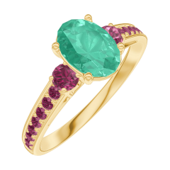 Anello Oro giallo 18 carati - Smeraldo Ovale 0.7 Carati - Pietre laterali Rubino - Incastonatura Rubino