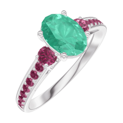 Anello Oro bianco 9 carati - Smeraldo Ovale 0.7 Carati - Pietre laterali Rubino - Incastonatura Rubino
