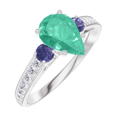 « L'ATELIER » N. 167068Anello Oro bianco 9 carati - Smeraldo Goccia 0.7 Carati - Pietre laterali Zaffiro blu - Incastonatura Diamante