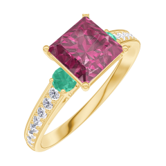 Anello Oro giallo 18 carati - Rubino Principessa 1 Carati - Pietre laterali Smeraldo - Incastonatura Diamante