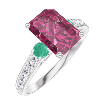 « L'ATELIER » Nº168087Anello Oro bianco 18 carati - Rubino Rettangolo 1 Carati - Pietre laterali Smeraldo - Incastonatura Diamante 4.6