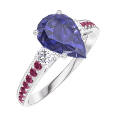 Anello Oro bianco 9 carati - Zaffiro blu Goccia 1 Carati - Pietre laterali Diamante - Incastonatura Rubino