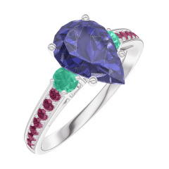 Anello Oro bianco 18 carati - Zaffiro blu Goccia 1 Carati - Pietre laterali Smeraldo - Incastonatura Rubino