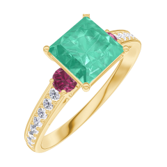 Anello Oro giallo 18 carati - Smeraldo Principessa 1 Carati - Pietre laterali Rubino - Incastonatura Diamante