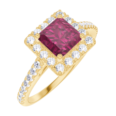 Anello Oro giallo 9 carati - Rubino Principessa 0.5 Carati - Halo Diamante - Incastonatura Diamante