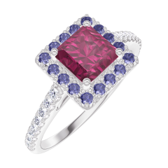Anello Oro bianco 9 carati - Rubino Principessa 0.5 Carati - Halo Zaffiro blu - Incastonatura Diamante